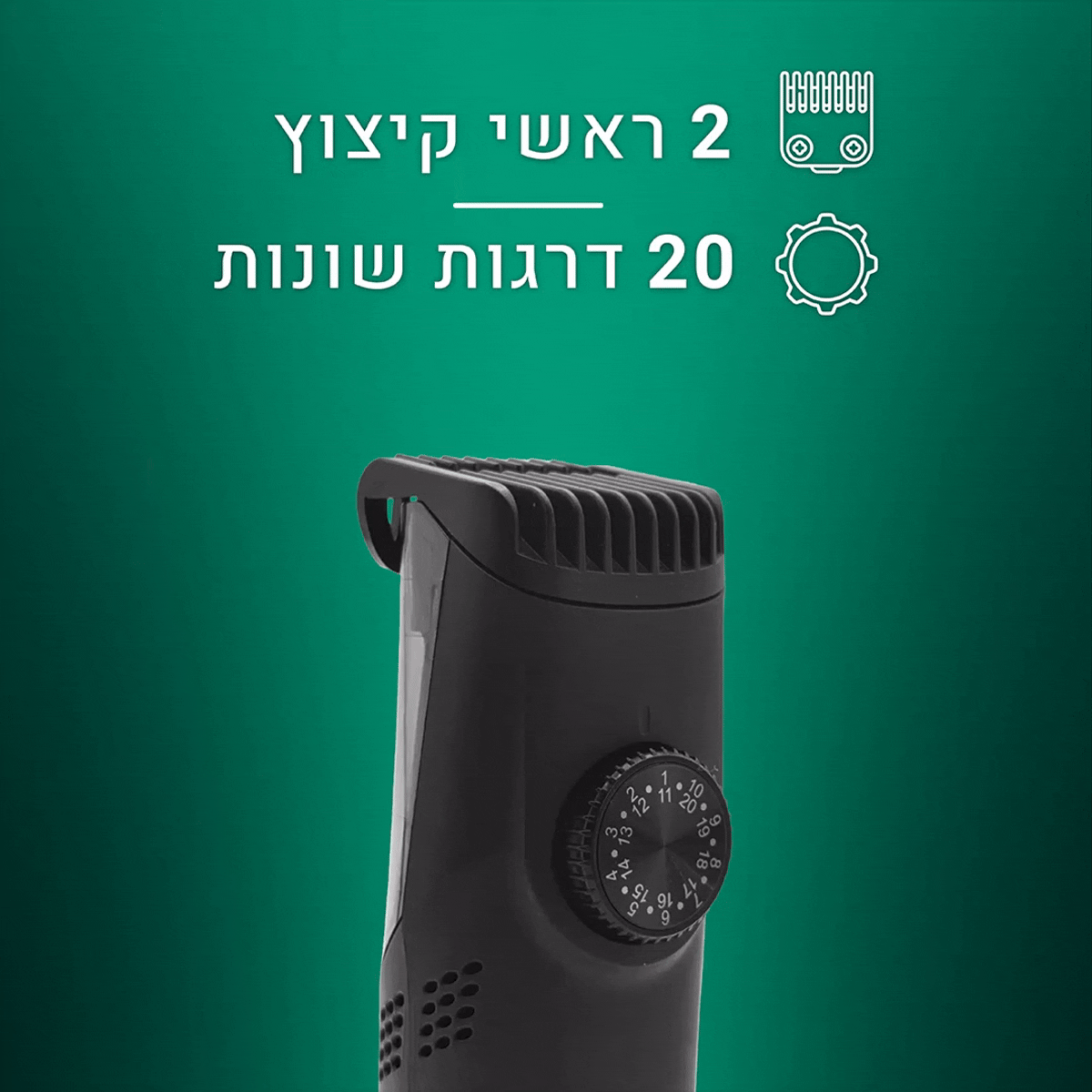 עם שני ראשי קיצוץ ו-20 דרגות שונות תוכל להחליט בדיוק איך לסדר את הזקן שלך ולהתאים אותו לכל סגנון שתרצה.